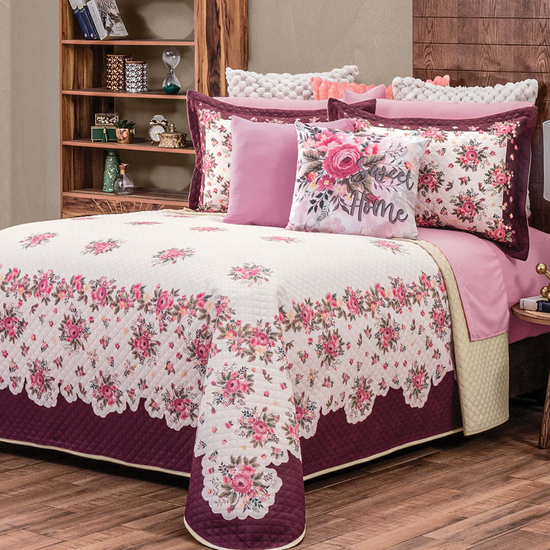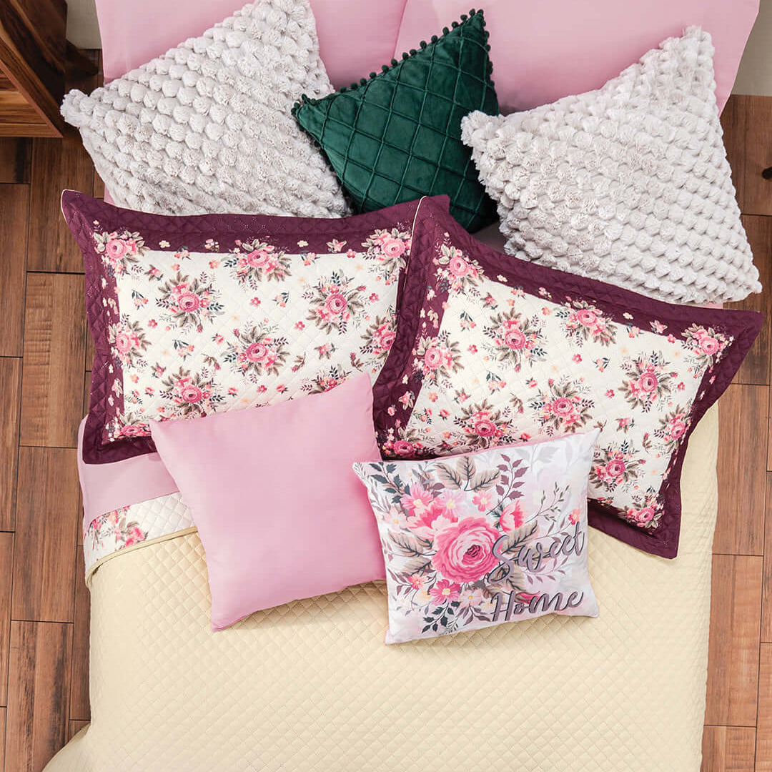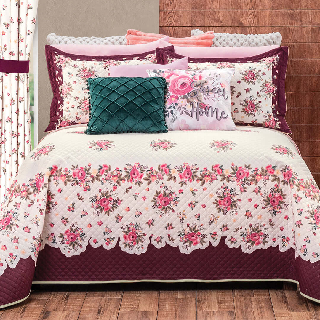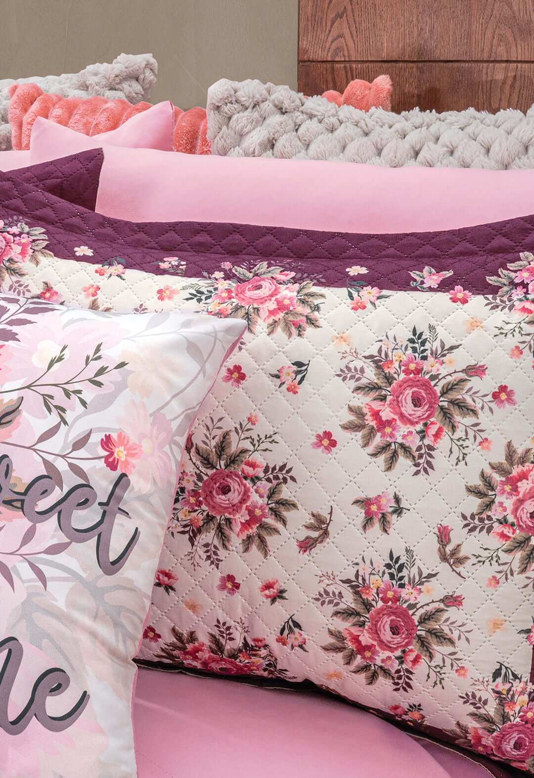 El coordinado de Colcha Yoseline , es un hermoso y completo juego floral en capitonado sin hilos que incluye un juego de sabanas que combina perfecto, y un par de cojines que resaltara su belleza
