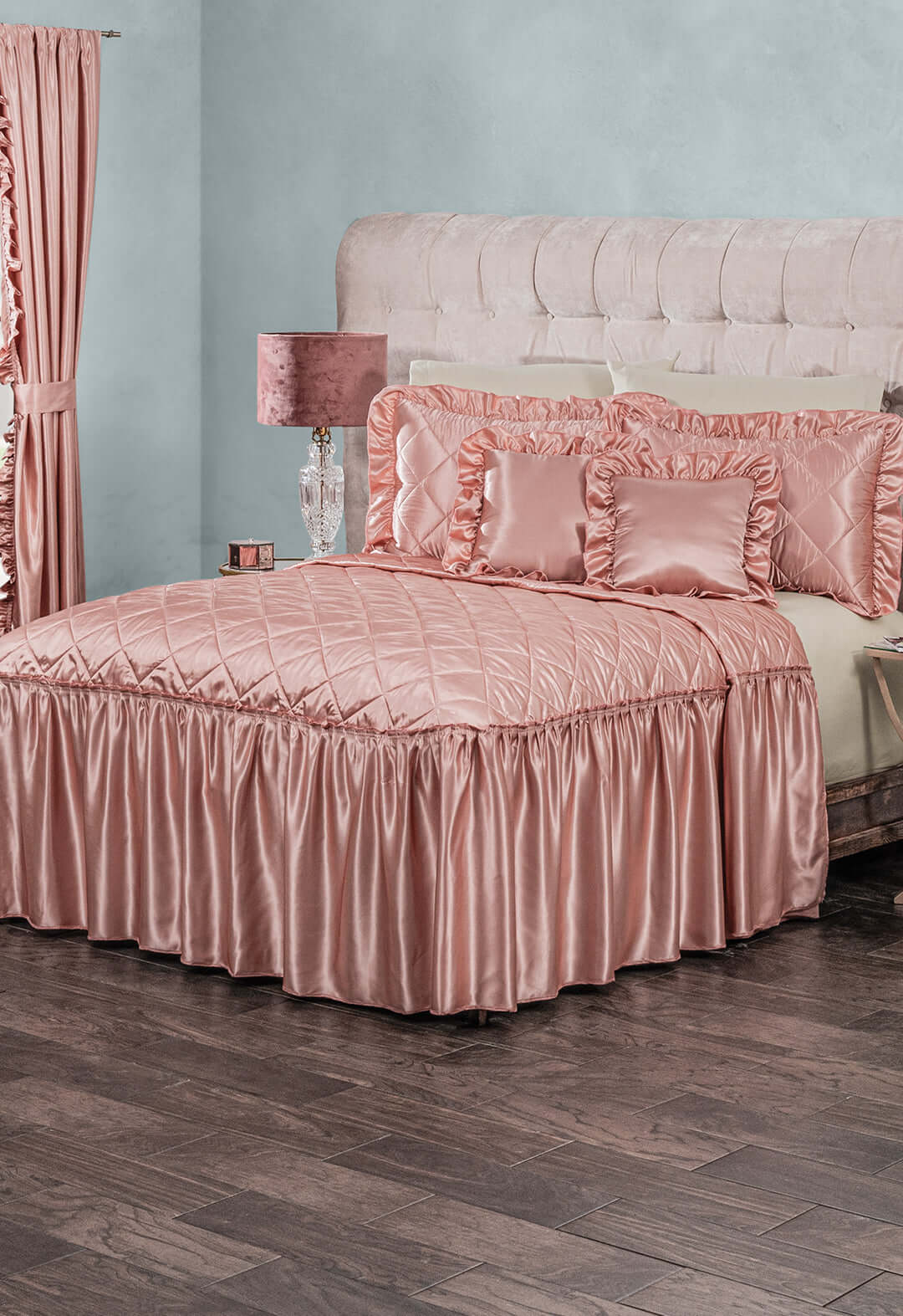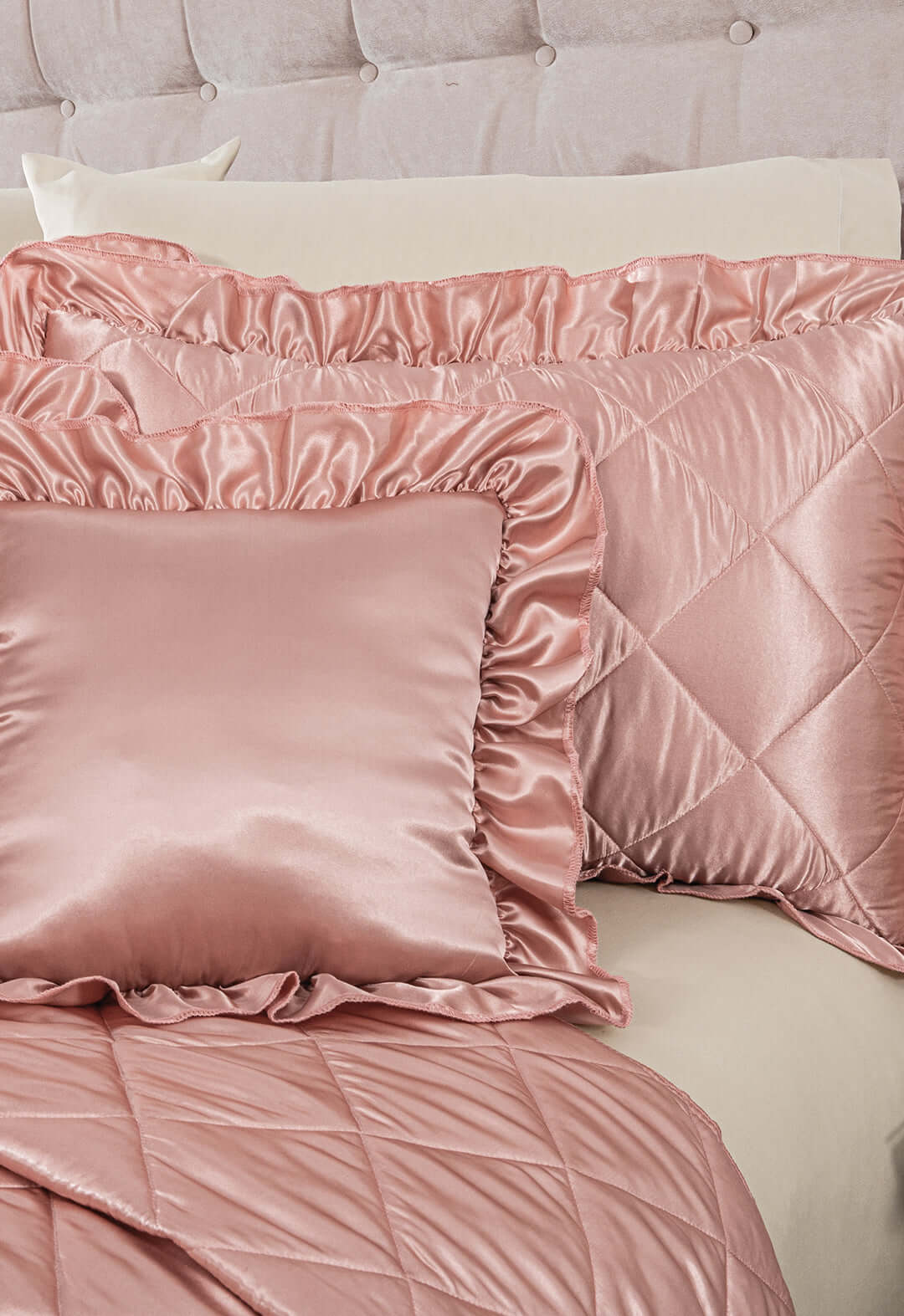 El juego de colcha satinada Roma, es tan linda y femenina que le dara a tu habitacion un aire muy romantico, es un completo set que incluye una colcha, fundas decorativas, y dos cojines, tienes tambien la posibilidad de combinarla con las cortinas Roma para un look mas completo
