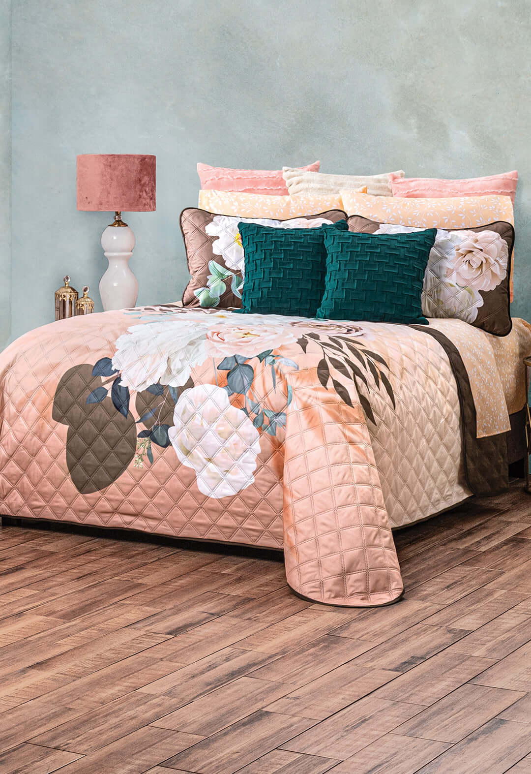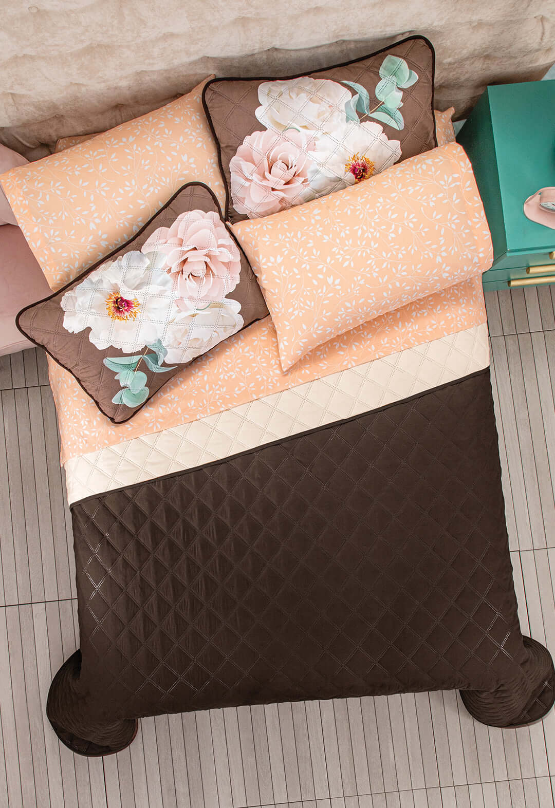 El coordinado de Edredon Olivia es un completo e impactante juego reversible en color salmon y cafe con diseño floral y con diseño capitonado sin hilos que incuye un hermoso juego de sabanas que combinan perfecto y realzaran la belleza de tu habitacion.