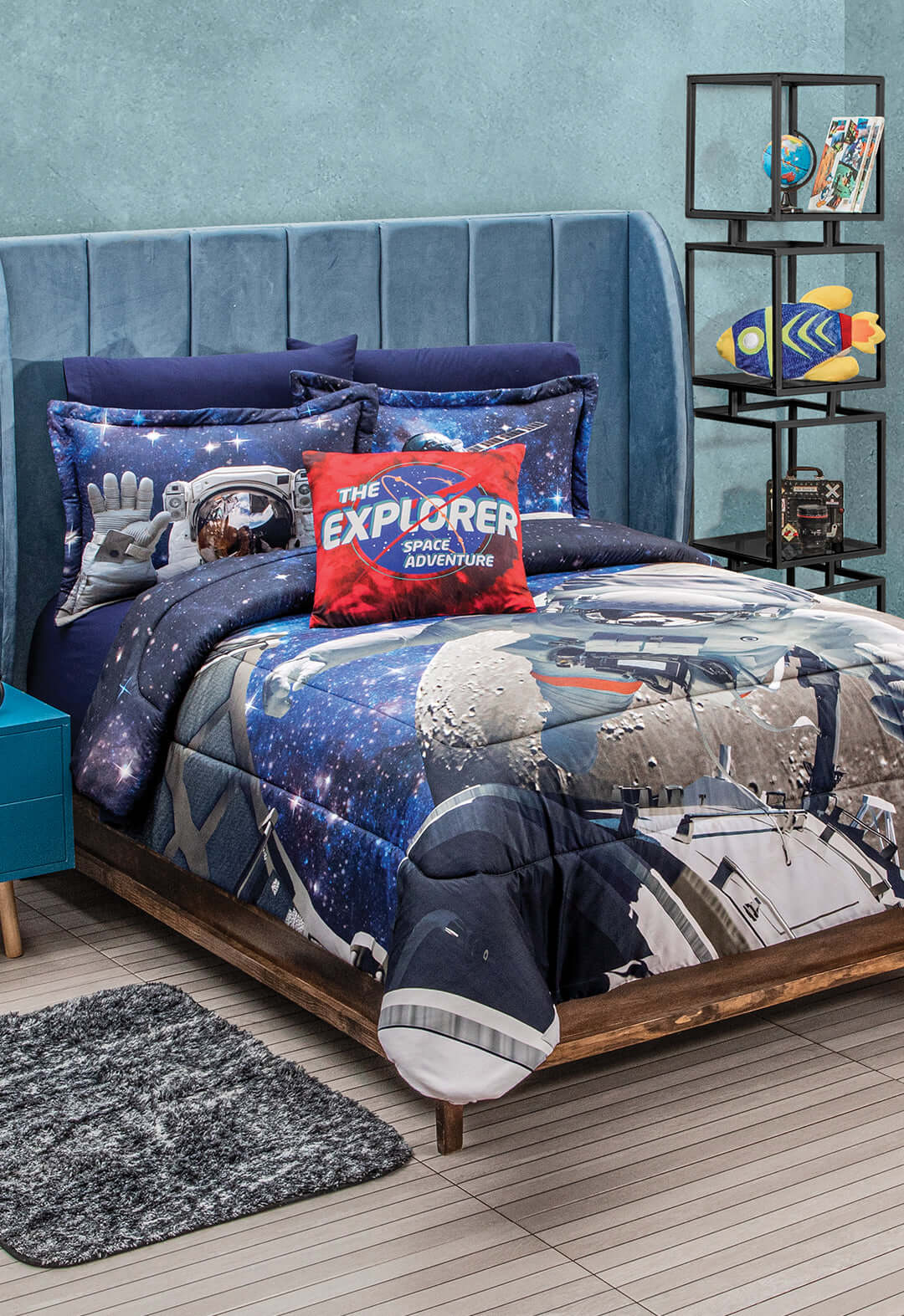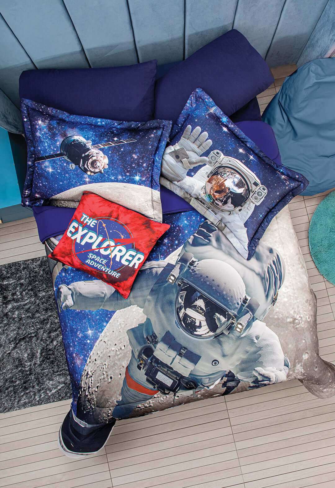 Para los mas pequeños, amantes de la ciencia y el espacio, el Juego de Edredon Cosmonauta es un lindo y divertido Set que incluye fundas decorativas y un cojin. Es reversible por lo que tienes la posibilidad de darle un look mas sencillo a la habitacion con solo girarlo.