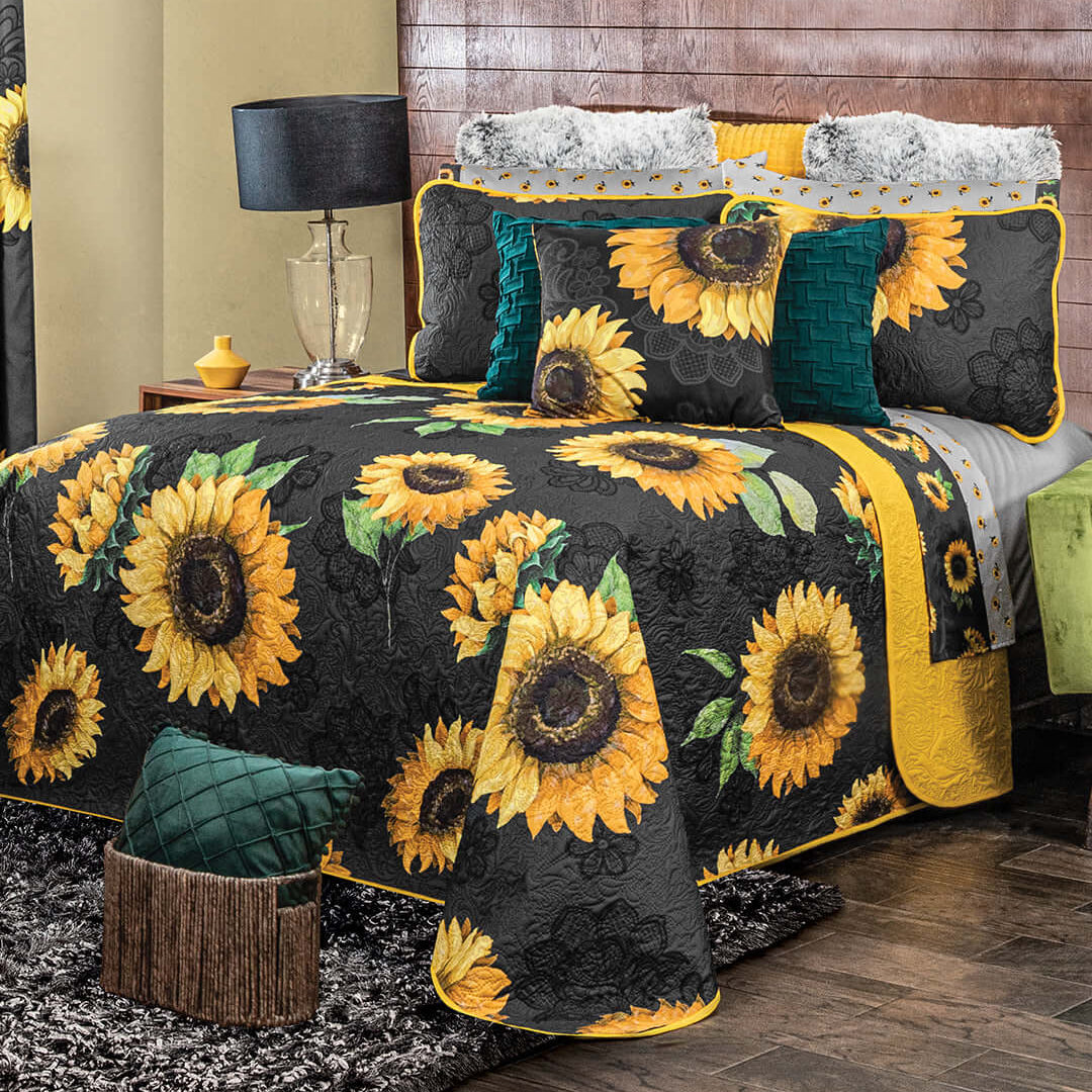 El coordinado de Edredon Amarelo, es un impactante y llamativo juego con diseño floral y reversible en color amarillo y capitonado sin hilos, incluye fundas decorativas, cojin y juego de sabanas