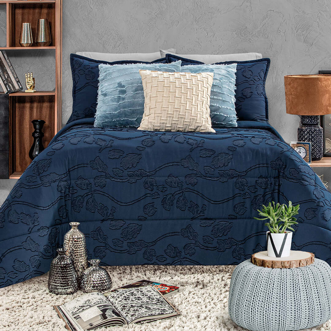 El azul profundo del Edredon Burgos, y su diseño texturizado y doble vista, lo hace encantador, es de facil lavado en casa e incluye fundas decorativas.
